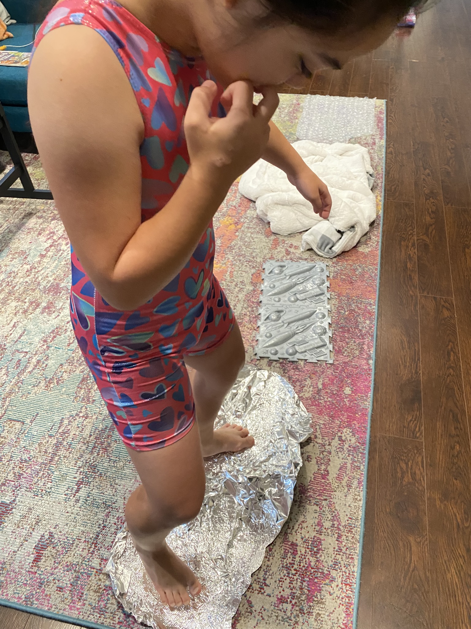 Lay out a “texture path” indoors with items like bubble wrap (crunchy snow), soft blanket (cozy), a bath mat (bumpy ice), and foil (crinkly frost). Let your child walk barefoot or with socks and describe* what they feel.
