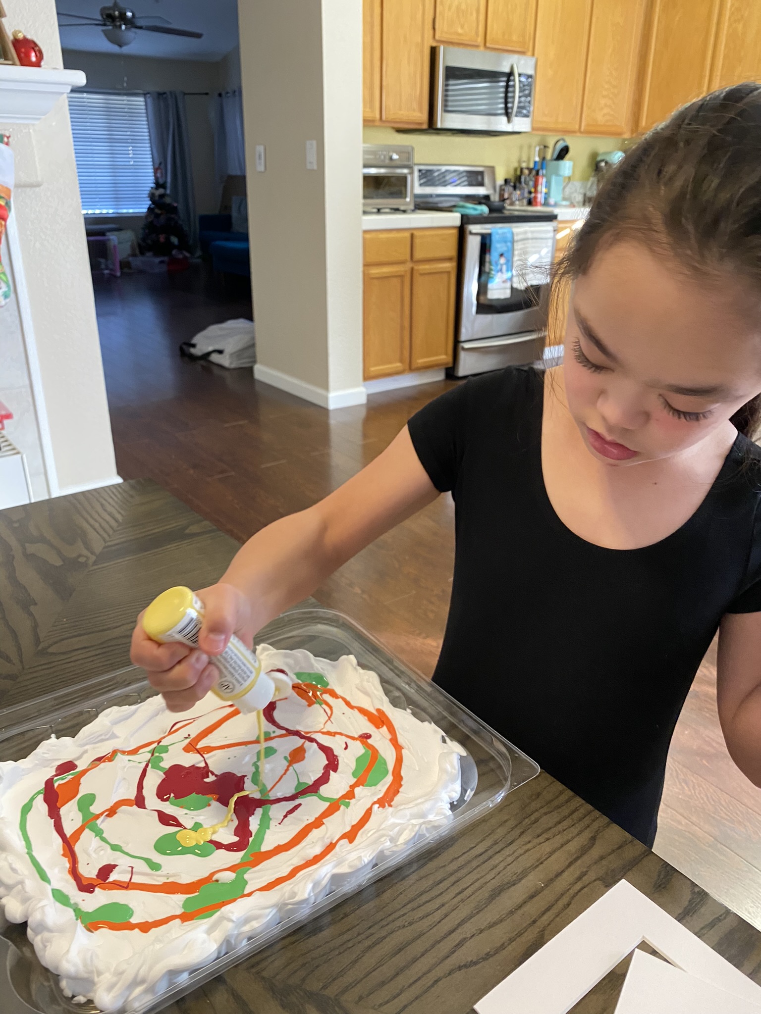 Shaving cream and "fall" seasonal colors of acrylic paint swirled together, then we placed a piece of paper on top to capture the pattern. Another simple project that you can extend if your student enjoying the process.